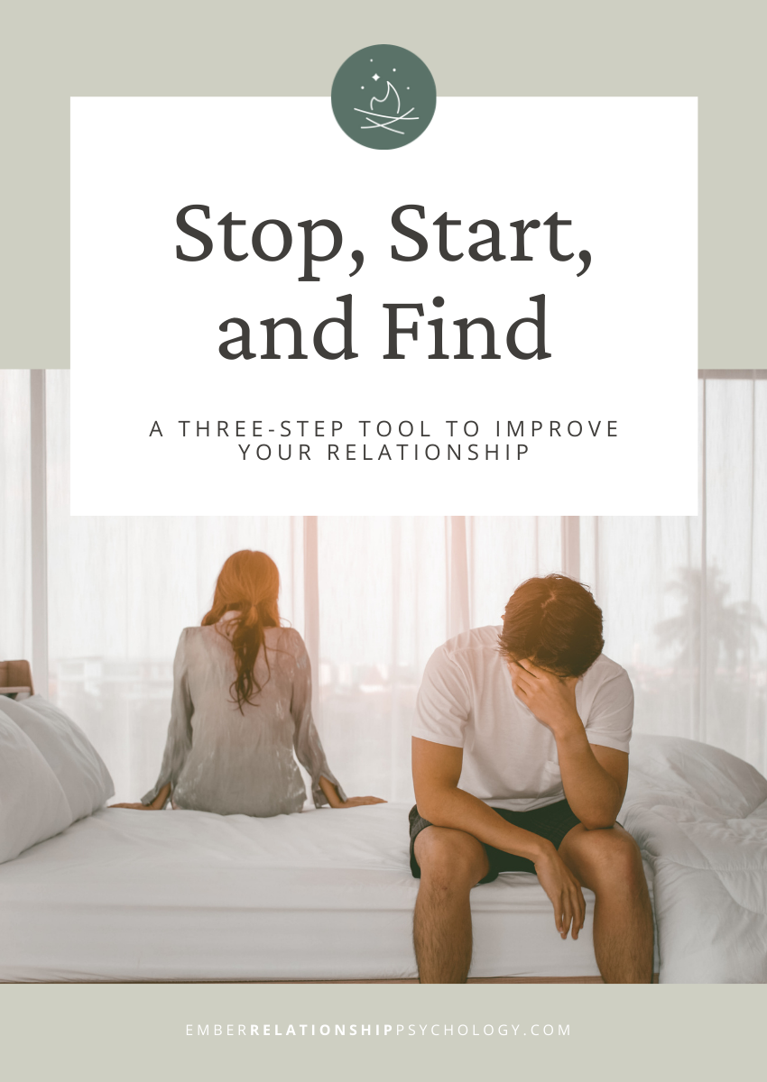 When as a couple you are struggling to connect, communicate, or to navigate a difficult time, situation, or path, it can be incredibly challenging to take the first step. Stop, Start, and Find is an effective method to pinpoint what changes need to take place. It helps you identify behaviours or priorities that need to stop, new patterns to start or positive habits to develop, while the third step emphasizes how you can actually accomplish it. It’s a great addition to any relationship repair toolkit.